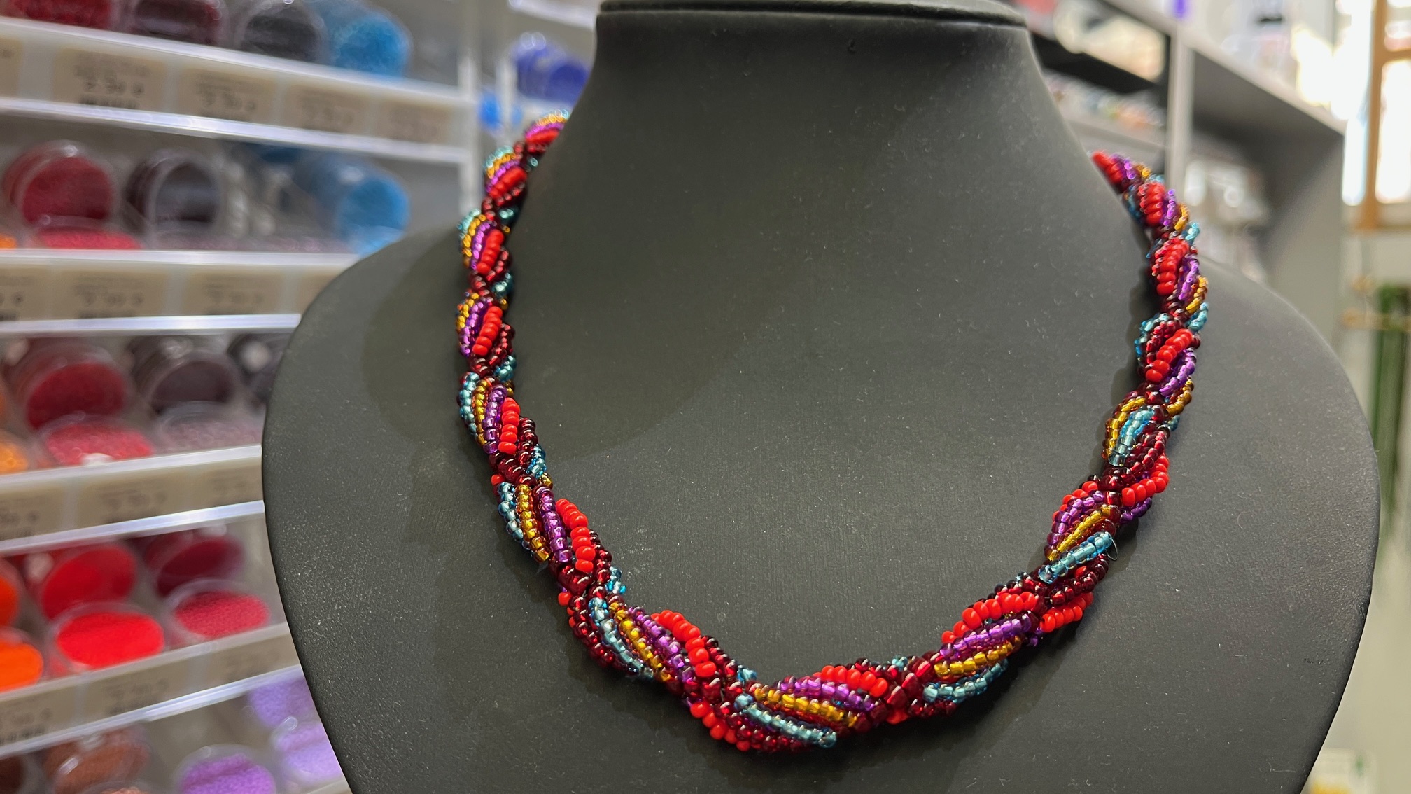 In diesem Schmuckkurs wird ein wunderschönes Collier gefädelt. Es kann aber natürlich auch ein Armband gemacht werden.